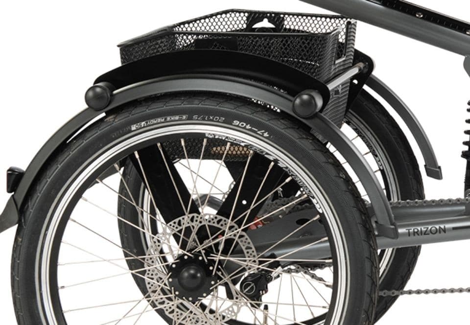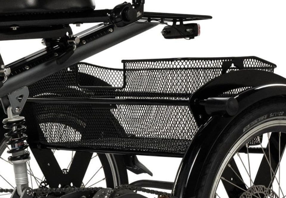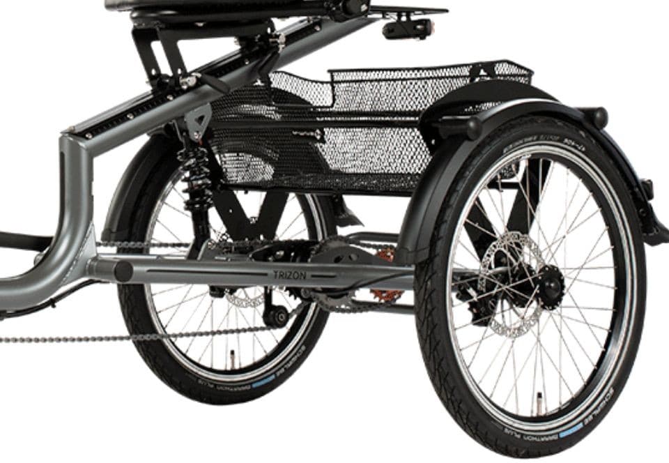 Pfautec Trizon driewieler met ergonomische stoel, 7 Nexus versnellingen, hydraulische schijfremmen met parkeerfunctie, geveerde achtervork en bagagemand.